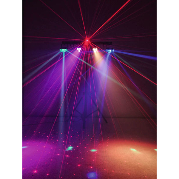 mit Laser, 2 rotierenden LED-Derbys, 2 LED-Spots und Strobe-LEDs in Weiß